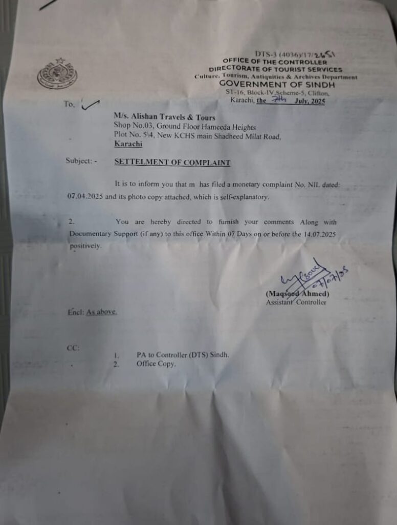 متاثرہ شہریوں کی جانب سے یہ بھی بتایا گیا ہے کہ ڈائریکٹوریٹ جنرل آف ٹورازم سروسز (DTS)، حکومتِ سندھ کی جانب سے علی شان ٹریول ایجنسی کے خلاف باقاعدہ نوٹس جاری کر دیا گیا ہے۔