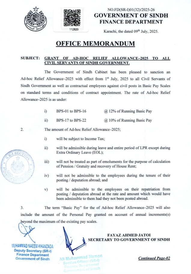 سندھ حکومت نے اپنے ملازمین کے لیے بڑی خوشخبری سنا دی! حکومت سندھ نے مالی سال 2025 کے لیے Ad-hoc Relief Allowance کی منظوری دے دی ہے، جو 1 جولائی 2025 سے نافذ العمل ہوگا۔