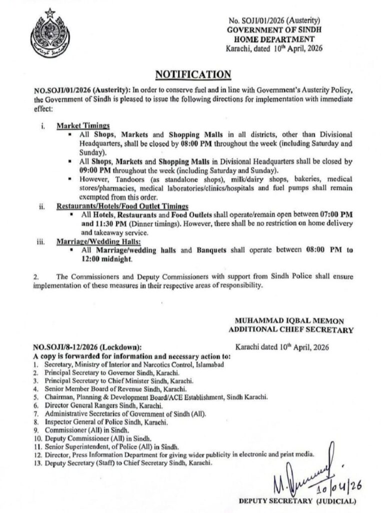 کراچی: حکومت سندھ کے محکمہ داخلہ نے 10 اپریل 2026 سے فوری طور پر نئے اوقات کار نافذ کرنے کا نوٹیفکیشن جاری کر دیا ہے۔